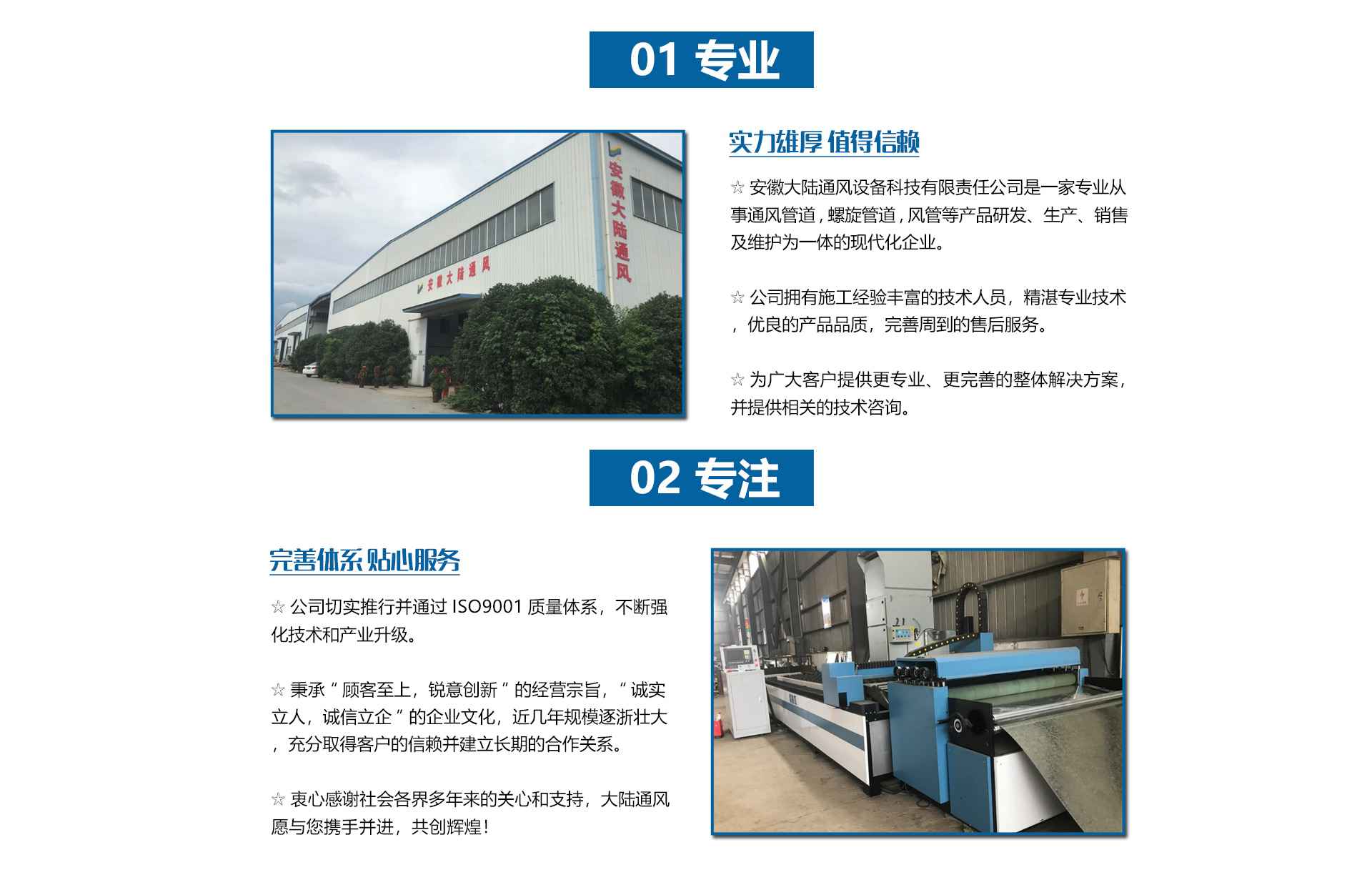安徽大陸通風(fēng)設(shè)備科技有限責(zé)任公司加工共板法蘭風(fēng)管、螺旋風(fēng)管、角鐵法蘭風(fēng)管、插接式風(fēng)管。價格合理。質(zhì)量保障。是國內(nèi)生產(chǎn)和研究通風(fēng)管道的企業(yè),工廠坐落于經(jīng)濟發(fā)達(dá)的安徽省合肥市。公司配備了好的自動化流水線設(shè)備和先進的制作安裝技術(shù)。